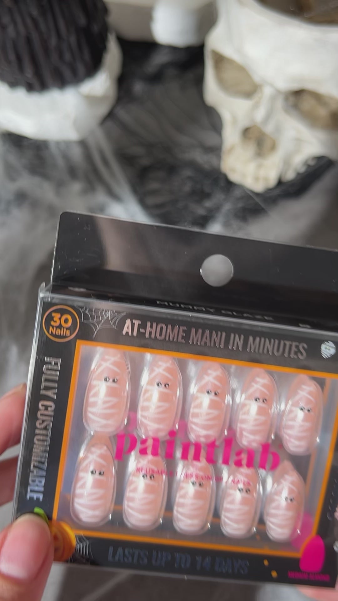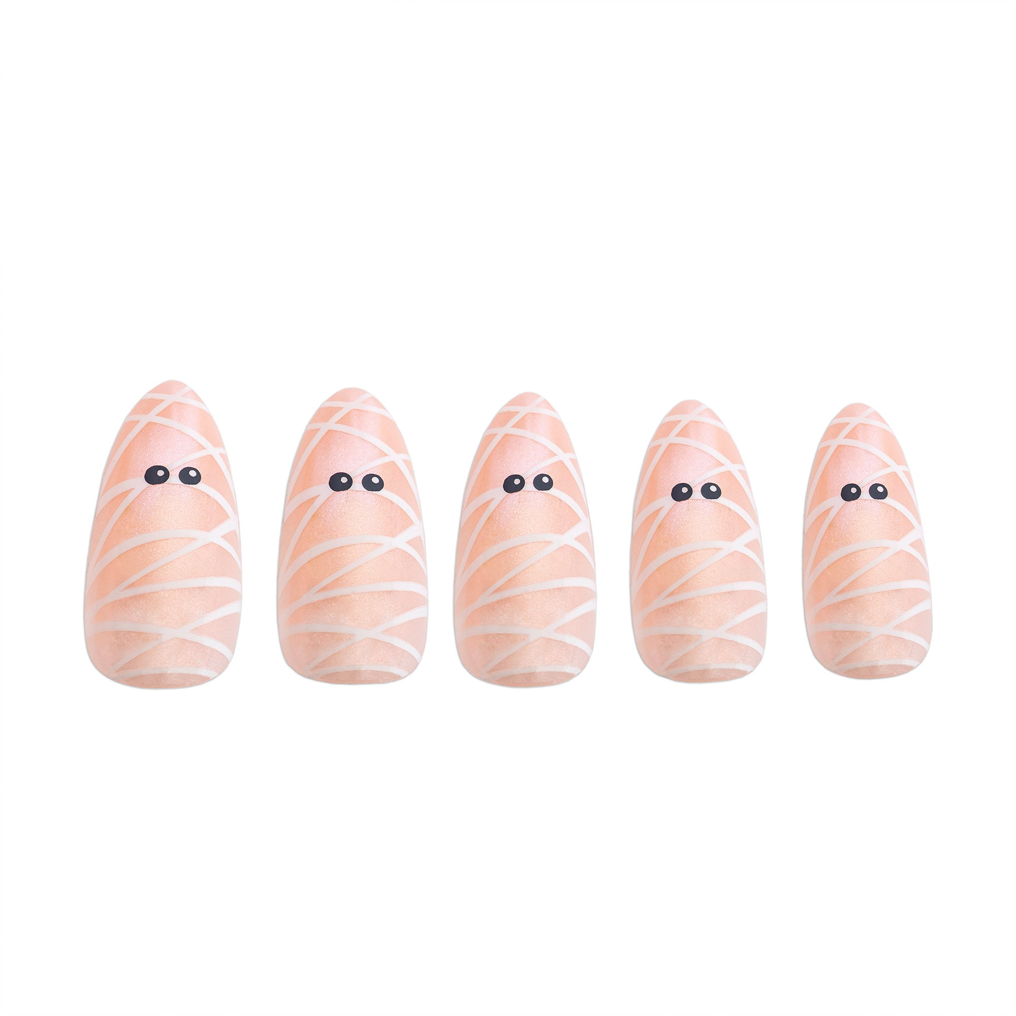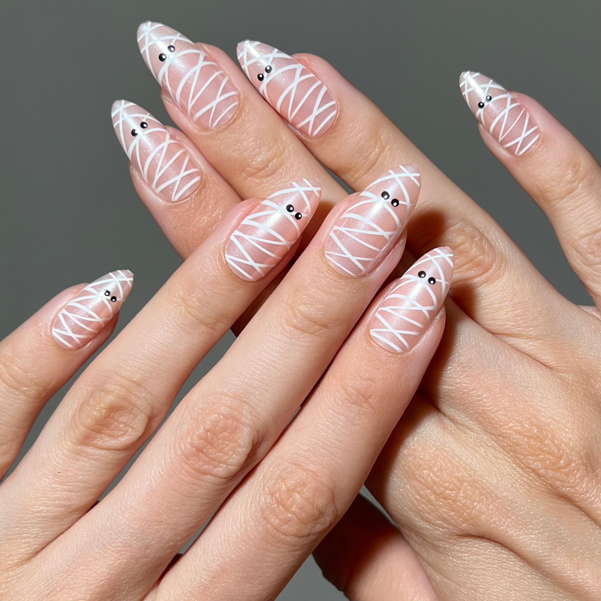 Nail your Halloween look with a mani that’s equal parts eerie and adorable. The Mummy Glaze Press-On Nails feature a sheer nude base wrapped in ghostly white bandage designs, accented with peek-a-boo black eyes for that classic mummy vibe.