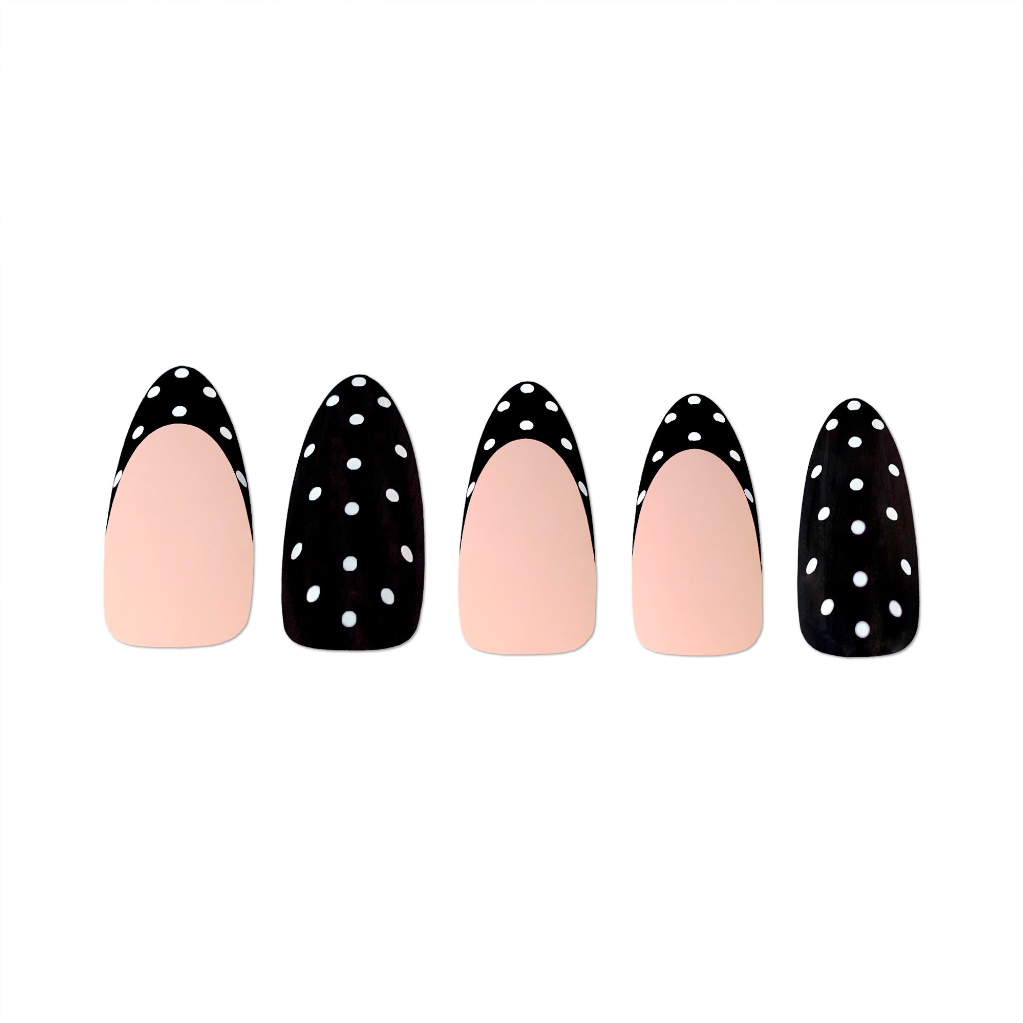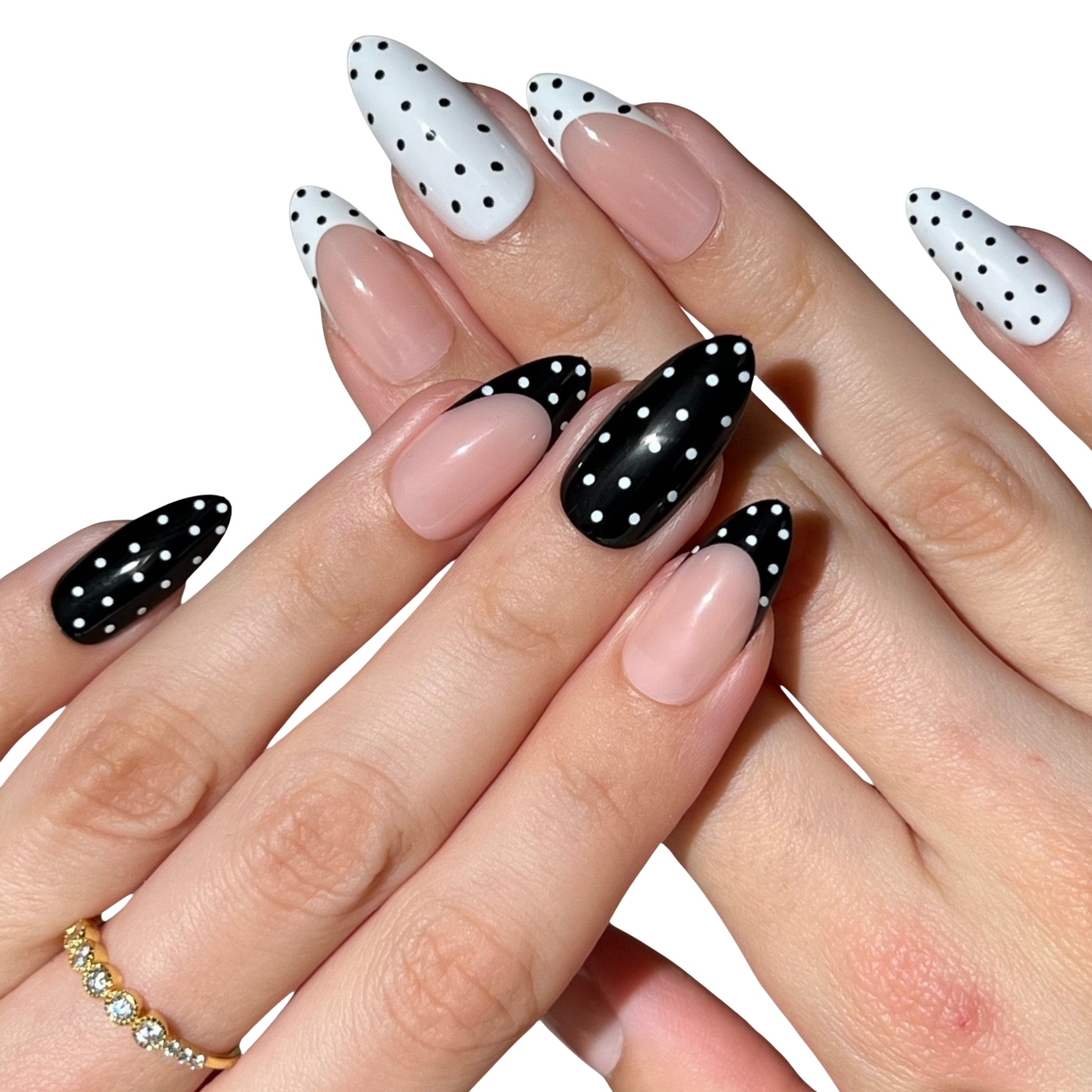 Timeless meets trendy with Polka Dot Couture — a playful twist on classic glam. Featuring a mix of glossy black and crisp white nails, each dotted to perfection, this almond-shaped set delivers instant sophistication with a touch of retro fun. Whether you’re styling for a night out or keeping it classy day-to-day, these press-ons make every hand gesture feel like a fashion moment.