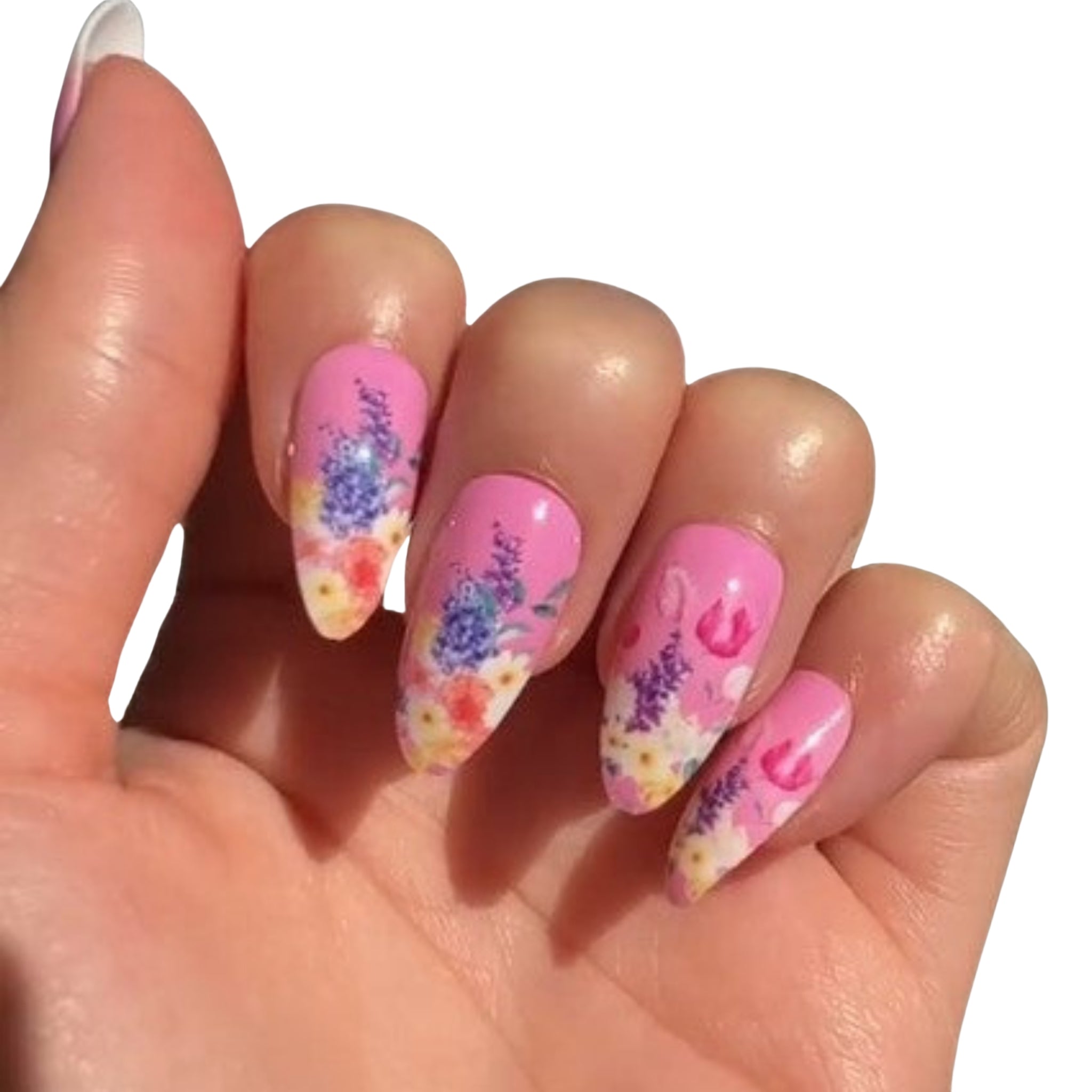 - Glue and Press - Apply a small amount of nail glue to one finger, press on nail, and hold for 25 seconds ensuring there is no air space in-between