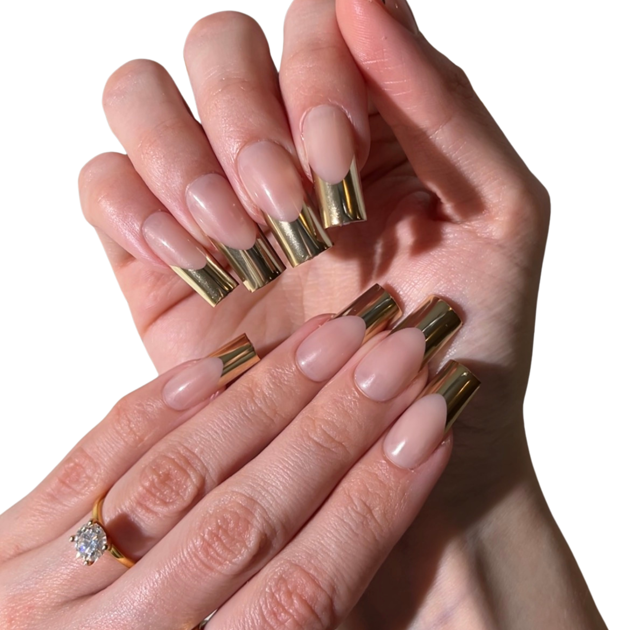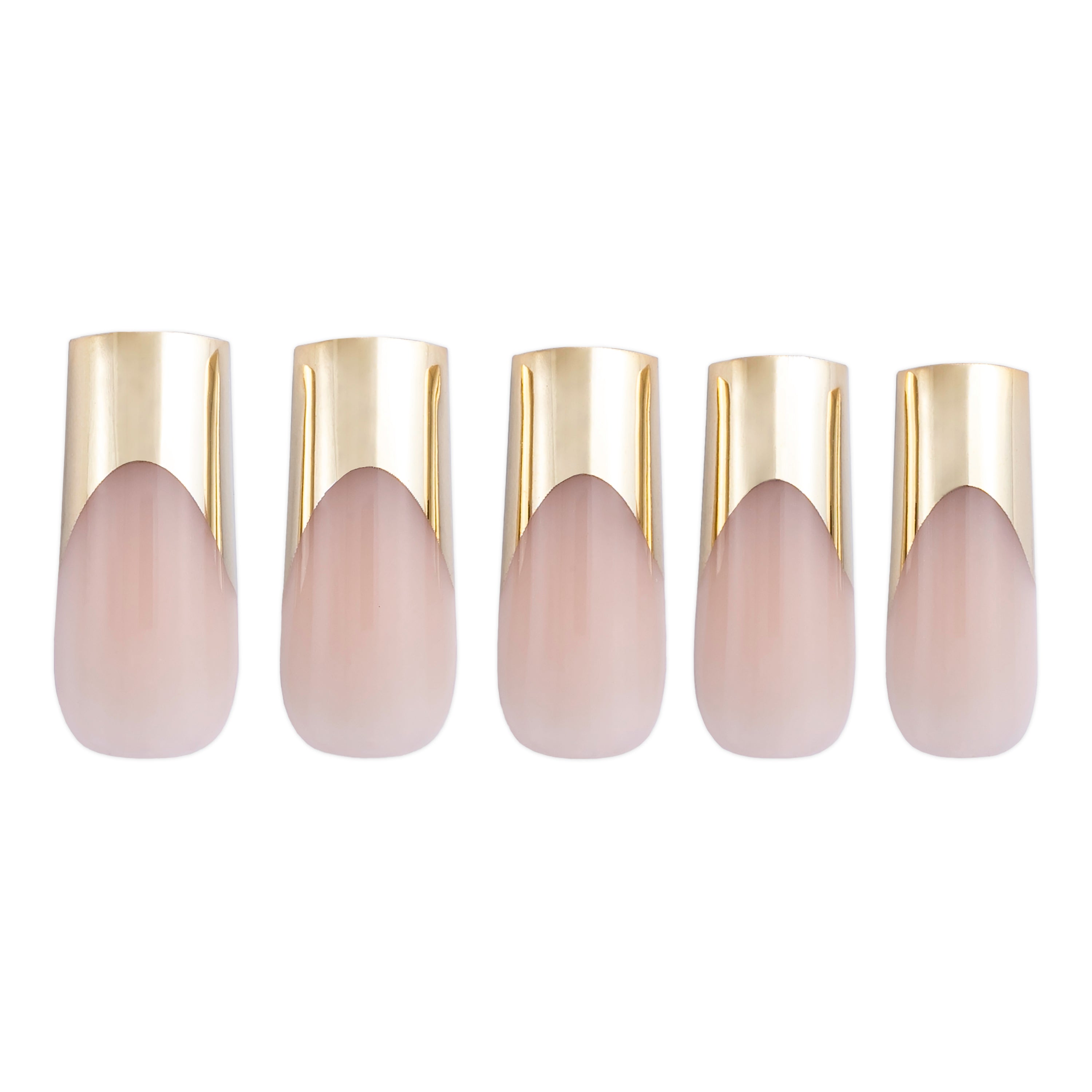 Step into luxury with 24K Tips—a modern twist on the classic French manicure. Featuring a nude base and curved metallic gold tips, this set delivers high-impact elegance with minimal effort. The sleek coffin shape adds edge and sophistication, making it perfect for both everyday glam and special occasions.