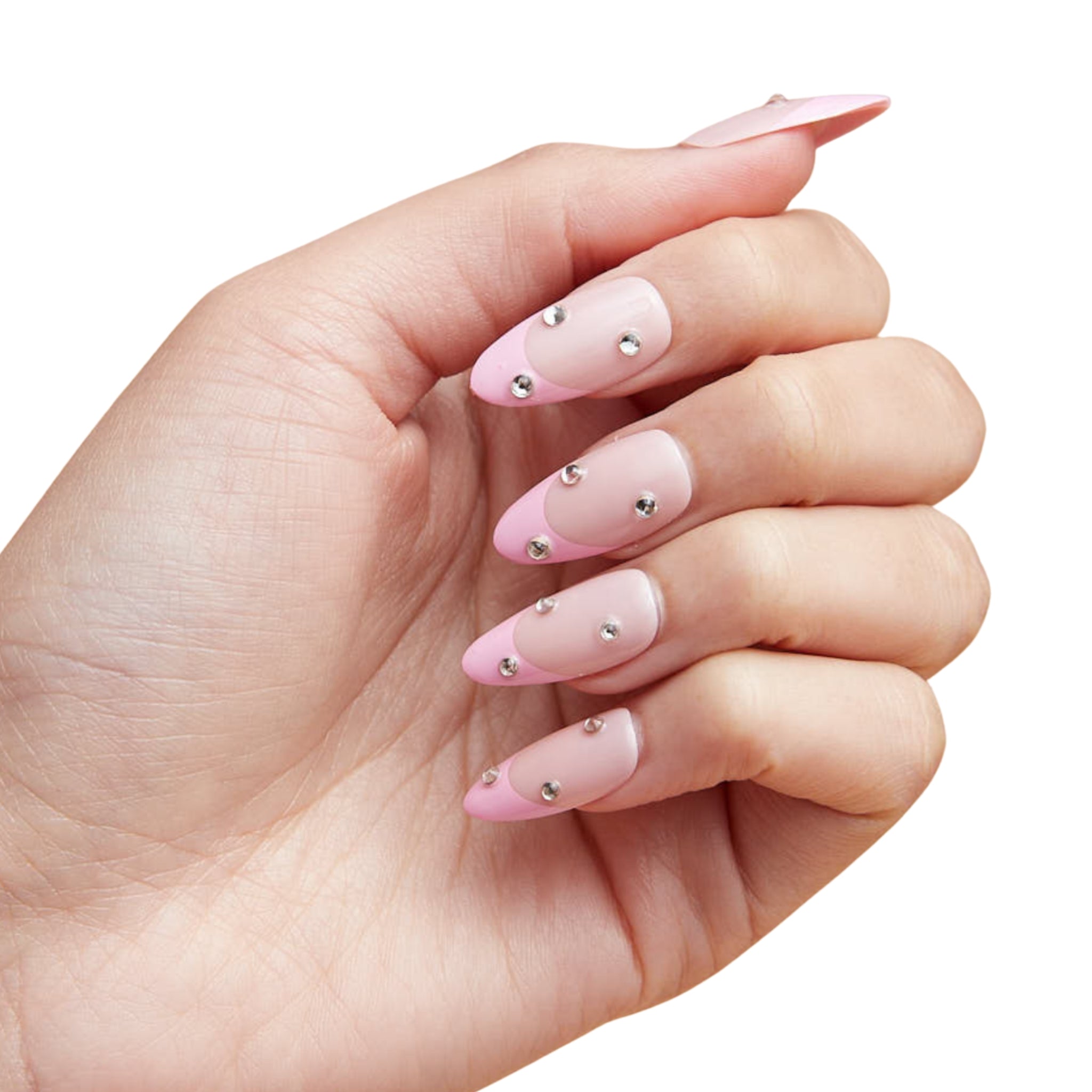 - 3D crystal accents on a light nude base for sparkle and dimension